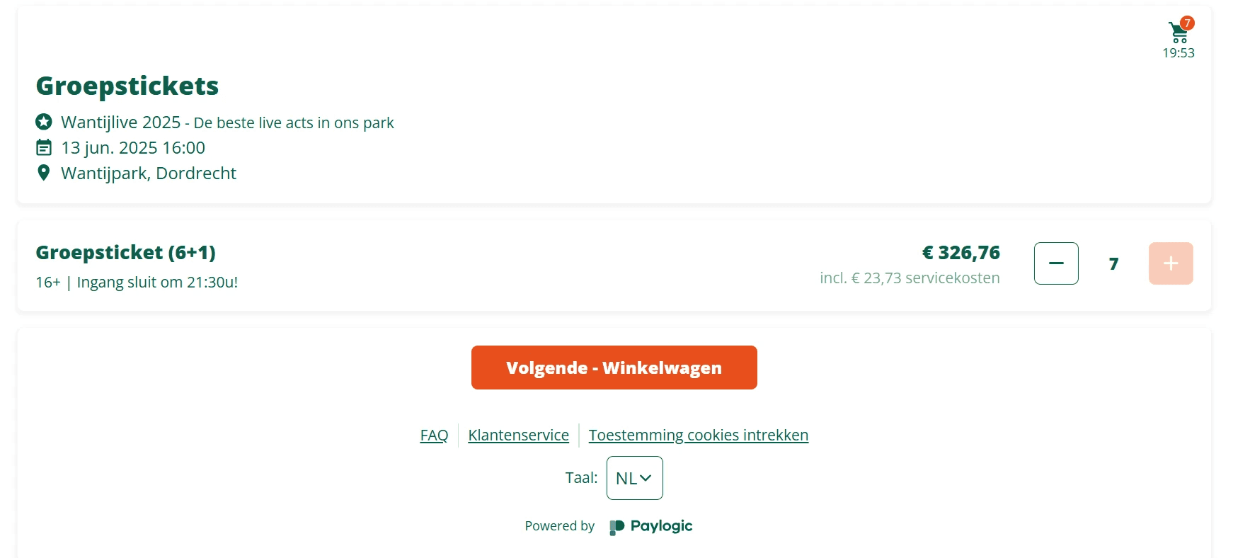 Het (6+1) groepsticket kan nu worden toegevoegd aan je winkelwagen.